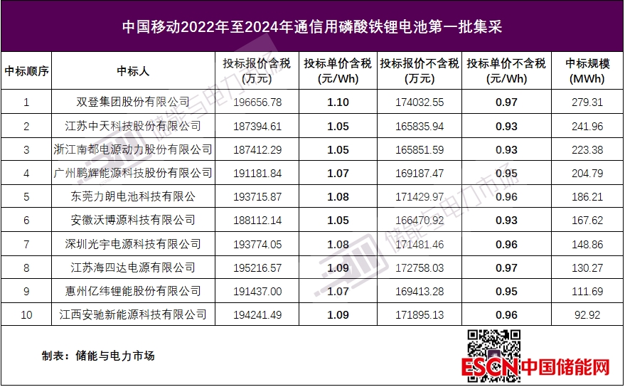 中國儲能網(wǎng)訊:近日,中國移動2022年至2024年通信用磷酸鐵鋰電池產(chǎn)品集中采購(第一批次)中標候選人公示。采購規(guī)模1.787GWh(單體電池3.2V磷酸鐵鋰電池,采購需求數(shù)量為5.5858億Ah)。