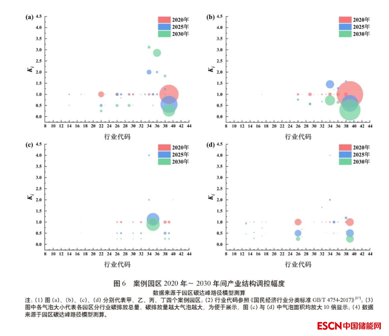 根據(jù)《國民經(jīng)濟行業(yè)分類》標準,19個行業(yè)在四個園區(qū)中均有體現(xiàn),四個行業(yè)存在于三家園區(qū),五個行業(yè)存在于兩個園區(qū),還有三個特異性行業(yè)僅存在于單個園區(qū),體現(xiàn)出園區(qū)個性與共性兼具的復合特征。統(tǒng)籌兼顧“持續(xù)改進、整體提升、對標先進”的優(yōu)化原則,應用模型調(diào)控園區(qū)產(chǎn)業(yè)結構并據(jù)此重新分配各行業(yè)間的碳排放配額, 圖6 揭示了各園區(qū)分行業(yè)2020年~2030 年間產(chǎn)業(yè)結構調(diào)整策略(以Ki 表示)。計算各行業(yè)的Ki 平均值后發(fā)現(xiàn),19個常見行業(yè)Ki 值的方差為0.35,而其余行業(yè)Ki 的方差僅為0.03。與一般產(chǎn)業(yè)相比,特異性行業(yè)的產(chǎn)業(yè)結構調(diào)整幅度更小,主要源于一般性產(chǎn)業(yè)具有更高的可替代性,因而在園區(qū)產(chǎn)業(yè)結構升級時會有較大波動,需關注此類產(chǎn)業(yè)在園區(qū)深入推動綠色低碳發(fā)展進程中的平穩(wěn)轉型。