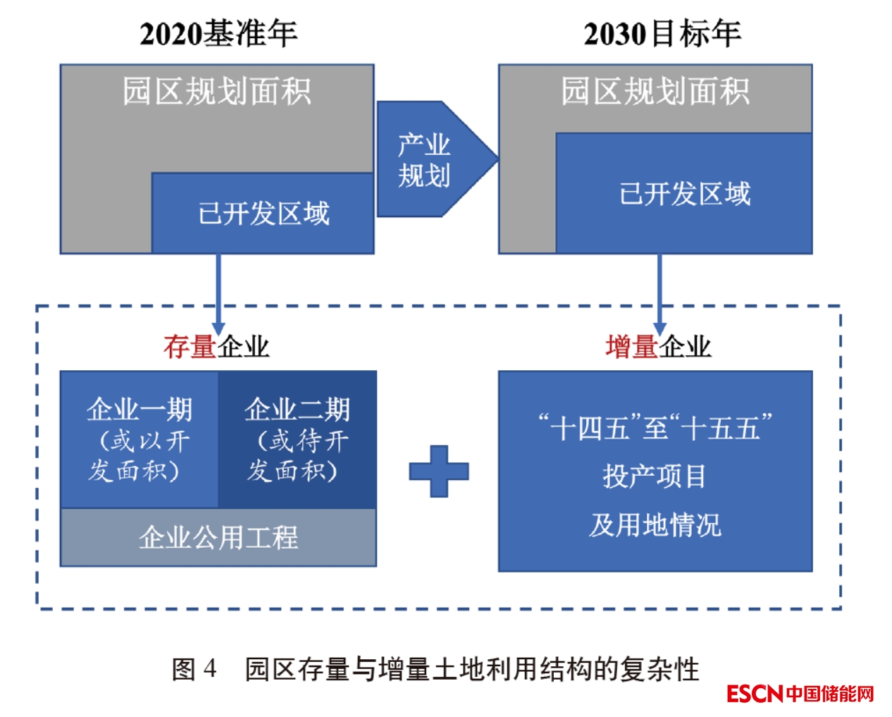 土地是工業(yè)園區(qū)承載經(jīng)濟生產(chǎn)活動的基礎,也直接決定了園區(qū)未來的產(chǎn)業(yè)發(fā)展?jié)摿?。因而模型以土地為出發(fā)點,在確定園區(qū)四大邊界前提下通過土地利用矢量圖與土地集約利用情況評價報告等資料,精準識別園區(qū)總規(guī)劃土地、未來潛在新增的可供應土地、企業(yè)已建土地與已批待建土地面積等數(shù)據(jù)。園區(qū)在實踐管理中形成了多樣的園區(qū)空間,總規(guī)劃土地面積并不是可以全部用于基礎設施與產(chǎn)業(yè)項目的布局,而已開發(fā)土地又可細分為存量企業(yè)不同時期的開發(fā)項目、企業(yè)公用工程、未來增量企業(yè)的新型投產(chǎn)項目,因此需集成未來產(chǎn)業(yè)布局與土地開發(fā)政策目標,系統(tǒng)統(tǒng)籌園區(qū)未來土地利用與產(chǎn)業(yè)發(fā)展前景(見圖4)。