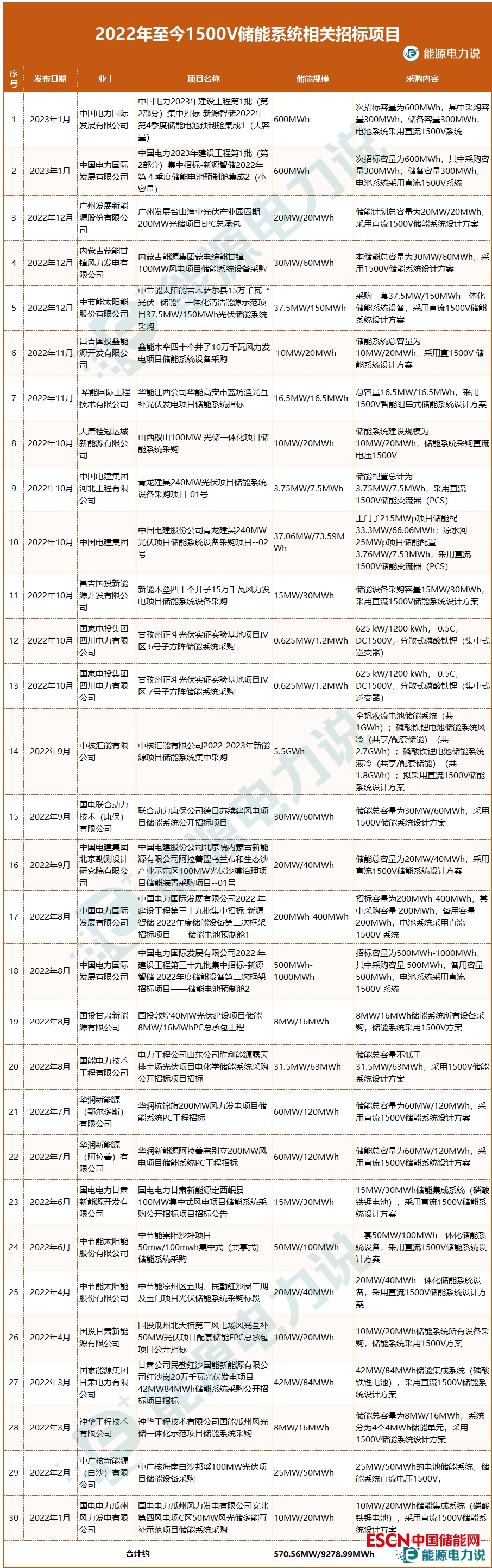 據(jù)不完全統(tǒng)計(jì),2022年以來(lái), 采用1500V儲(chǔ)能系統(tǒng)的招標(biāo)項(xiàng)目超9GWh,其中“中核匯能有限公司2022-2023年新能源項(xiàng)目?jī)?chǔ)能系統(tǒng)集中采購(gòu)項(xiàng)目”,采購(gòu)全釩液流及磷酸鐵鋰電池儲(chǔ)能系統(tǒng)總規(guī)模達(dá)5.5GWh,明確項(xiàng)目擬采用直流1500V儲(chǔ)能系統(tǒng)設(shè)計(jì)方案。從近期招標(biāo)項(xiàng)目數(shù)量來(lái)看,1500V儲(chǔ)能系統(tǒng)已成為各發(fā)電集團(tuán)主流儲(chǔ)能系統(tǒng)電壓等級(jí)。