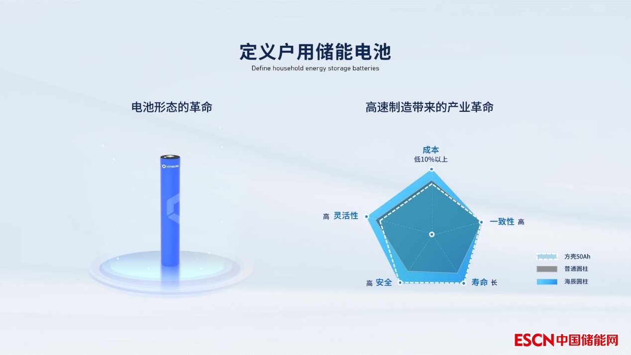 海辰大圓柱戶用儲能專用電池與傳統(tǒng)小方殼以及小圓柱電池相比,在成本、配組靈活性、安全性、壽命以及一致性上實(shí)現(xiàn)了大幅提升。例如在成本方面,大圓柱電池在生產(chǎn)方面依托高速產(chǎn)線輸出,成本優(yōu)勢明顯,其相較傳統(tǒng)生產(chǎn)低10%以上;又如在循環(huán)壽命方面較傳統(tǒng)圓柱電池大幅提升,突破5000次大關(guān);同時,其靈活適配性更強(qiáng),可滿足戶用儲能應(yīng)用場景定制化需求。