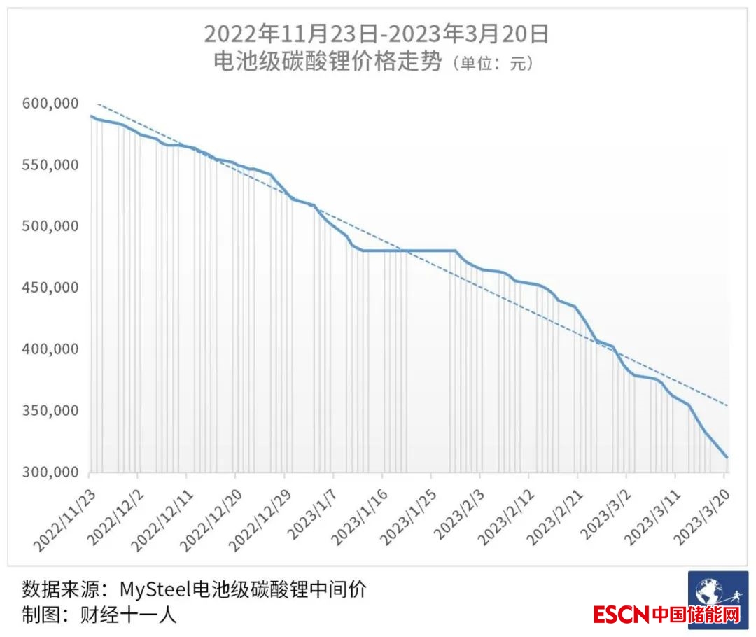 當日,電池級碳酸鋰中間價跌至31.25萬元,單日跌幅15500元,相比2022年11月23日59萬元/噸的中間價峰值,已跌去近一半。