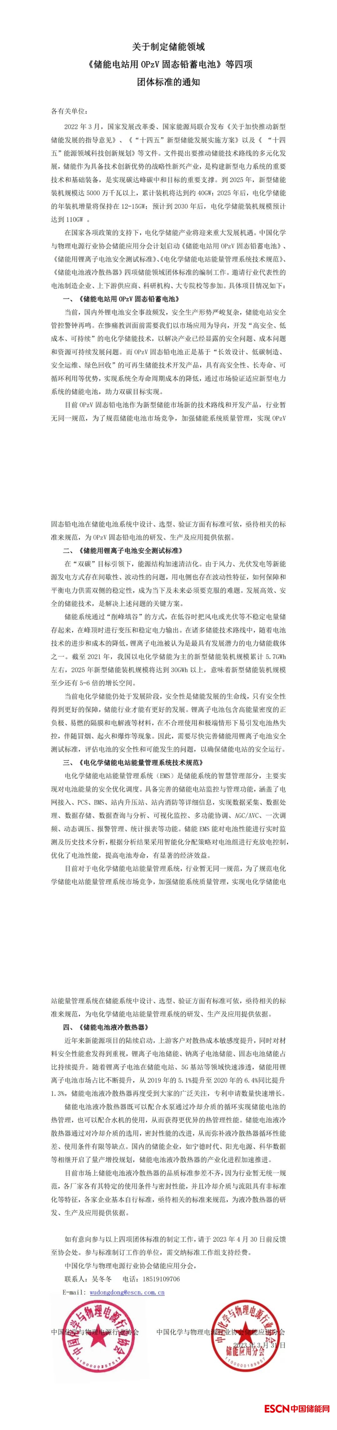 在國家各項政策的支持下,電化學(xué)儲能產(chǎn)業(yè)將迎來重大發(fā)展機遇。中國化學(xué)與物理電源行業(yè)協(xié)會儲能應(yīng)用分會計劃啟動《儲能電站用OPzV固態(tài)鉛蓄電池》、《儲能用鋰離子電池安全測試標(biāo)準(zhǔn)》、《電化學(xué)儲能電站能量管理系統(tǒng)技術(shù)規(guī)范》、《儲能電池液冷散熱器》四項儲能領(lǐng)域團(tuán)體標(biāo)準(zhǔn)的編制工作。邀請行業(yè)代表性的電池制造企業(yè)、上下游供應(yīng)商、科研機構(gòu)、大專院校等參加。具體項目情況如下:
