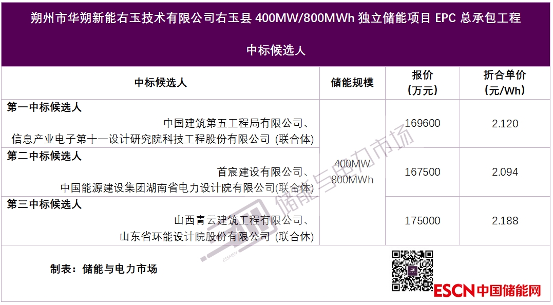 中國能源建設集團山西省電力勘測設計院有限公司以286656萬元,折合單價3.583元/Wh,中標朔州市華朔新能源技術有限公司右玉縣400MW/800MWh獨立儲能項目EPC總承包工程。