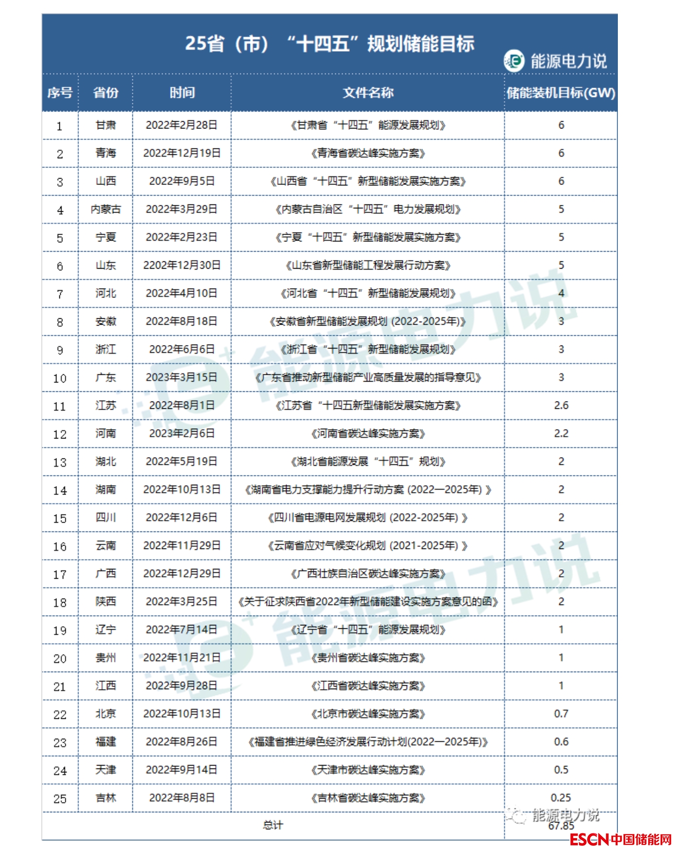 “十四五”是儲能由商業(yè)化初期向規(guī)模化發(fā)展轉(zhuǎn)變的關鍵階段。目前,已有25個?。ㄊ校┮?guī)劃了“十四五”期間的新型儲能裝機目標及具體規(guī)劃,到2025年,預計新型儲能裝機目標將達到67.85GW。青海、甘肅、山西的儲能規(guī)模最大,預計新型儲能裝機將達到6GW;山東、寧夏和內(nèi)蒙古緊隨其后,預計新型儲能裝機將達到5GW。