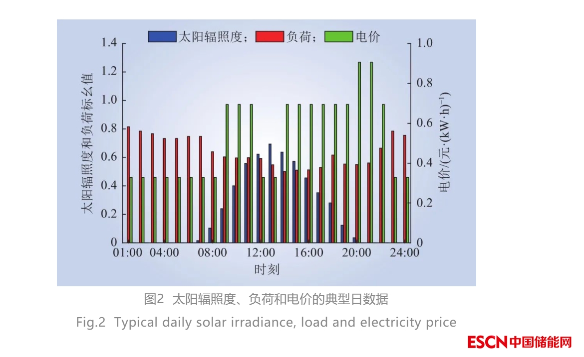 光照場景選取夏季光照曲線,太陽輻照基準值設為1 000 W/m2。負荷場景選用典型的工業(yè)負荷,負荷基值參照文獻[25]。電價數(shù)據(jù)參考某省工業(yè)分時電價。上述參數(shù)在典型日各時段數(shù)據(jù)如圖2所示。