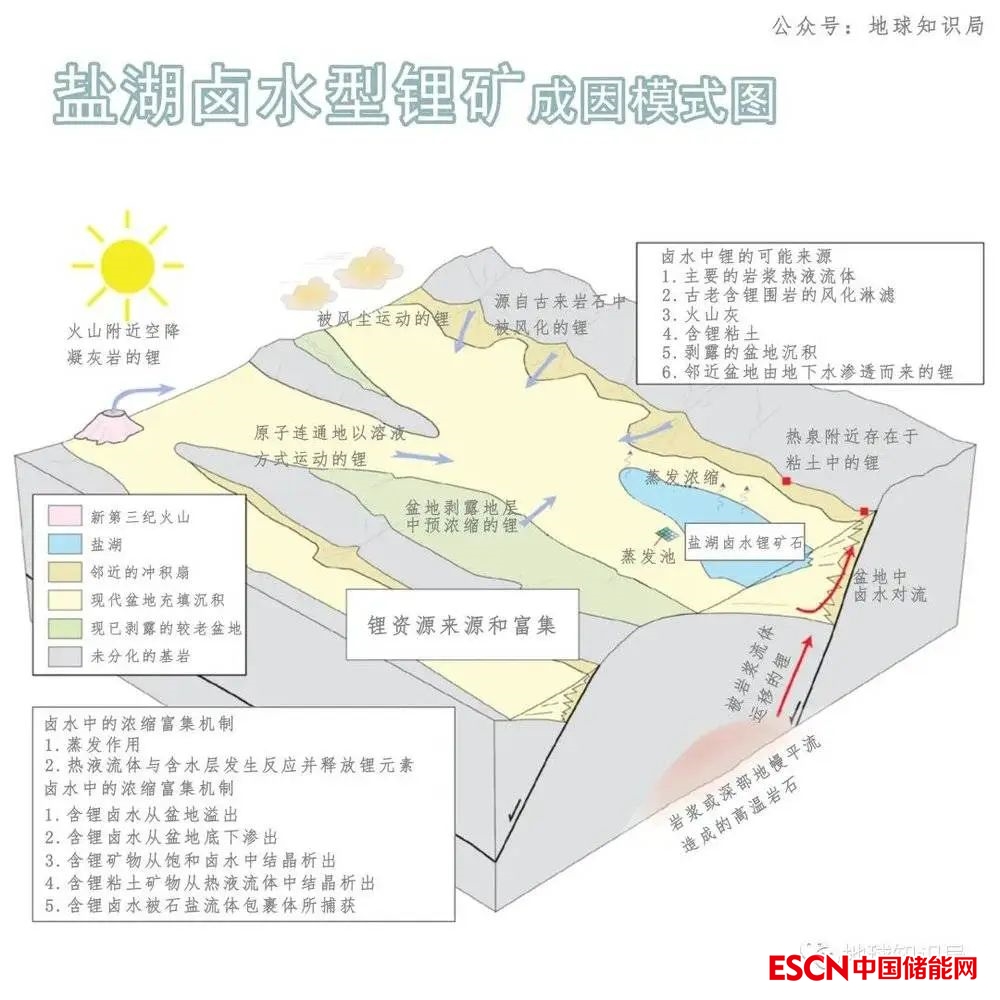 鹽湖鋰的主要來(lái)源是新生代的火山和地?zé)峄顒?dòng)。地?zé)崴畷?huì)淋濾地層和礦物中的鋰元素,并將其運(yùn)移,再通過(guò)火山和地?zé)嶙饔脦У降乇?,匯聚在鹽湖中。地?zé)徇€會(huì)加速水分蒸發(fā),相當(dāng)于加速鋰元素的濃縮富集。