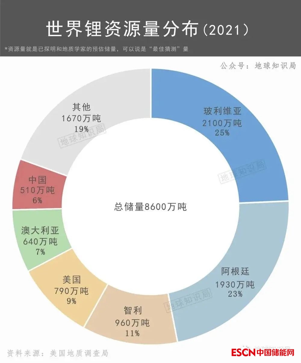 中國(guó)的鋰,從儲(chǔ)量來(lái)看并不算太少,根據(jù)相關(guān)統(tǒng)計(jì)數(shù)據(jù),全球鋰資源量8600萬(wàn)噸,所謂資源量就是已探明的量,加上地質(zhì)學(xué)家預(yù)估的儲(chǔ)量,可以說(shuō)是“最佳猜測(cè)值”,其中已探明儲(chǔ)量是2100萬(wàn)噸。