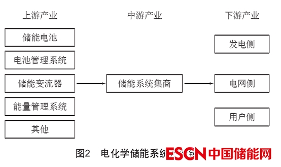 隨著電化學(xué)儲能技術(shù)快速發(fā)展、企業(yè)多方參與、應(yīng)用日趨完善,已經(jīng)形成了由上游產(chǎn)業(yè)、中游產(chǎn)業(yè)、下游產(chǎn)業(yè)組成的應(yīng)用產(chǎn)業(yè)鏈,具體如圖2所示。