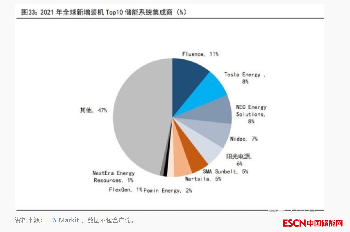 據(jù) IHS Markit 對2021年全球新增儲能裝機功率容量統(tǒng)計排序, Fluence(11%)、Tesla(8%)、NEC(8%)分別位列全球新增儲能系統(tǒng)裝機前三,陽光電源位列全球儲能系統(tǒng)集成商第五,全球市占率為6%,比亞迪未進(jìn)入前十。