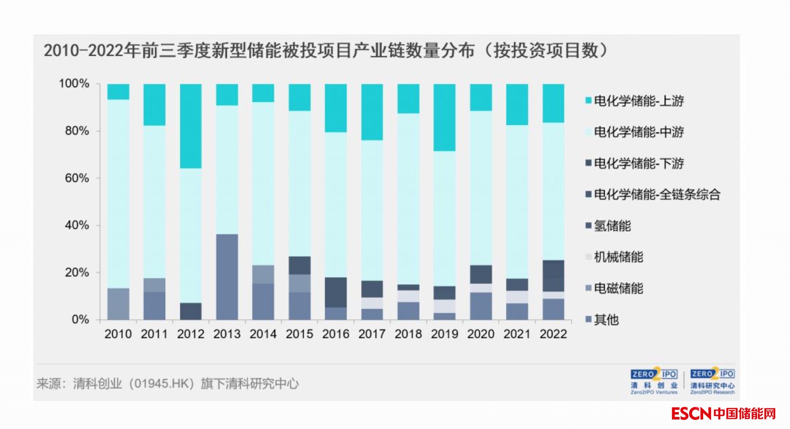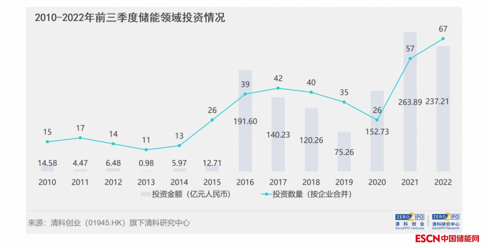 投資方面,截至2022年9月,中國股權(quán)投資市場對儲能領(lǐng)域項目投資累計近400起,涉及投資金額約1,300億元。儲能領(lǐng)域項目投資在時間分布上的走勢與基金募集情況十分相似,也呈現(xiàn)階梯式上升特征。