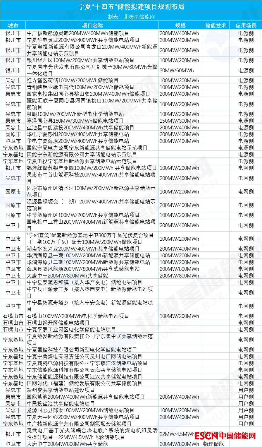 根據(jù)分區(qū)布局建議,十四五期間寧夏擬建50個電源側(cè)、電網(wǎng)側(cè)、用戶側(cè)以及物理儲能項目等各類項目,在6地市規(guī)劃的儲能規(guī)模力爭達(dá)到5.45GW。