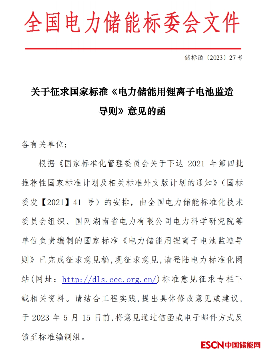 關(guān)于征求國家標(biāo)準(zhǔn)《 電力儲能用鋰離子電池監(jiān)造導(dǎo)則》意見的函