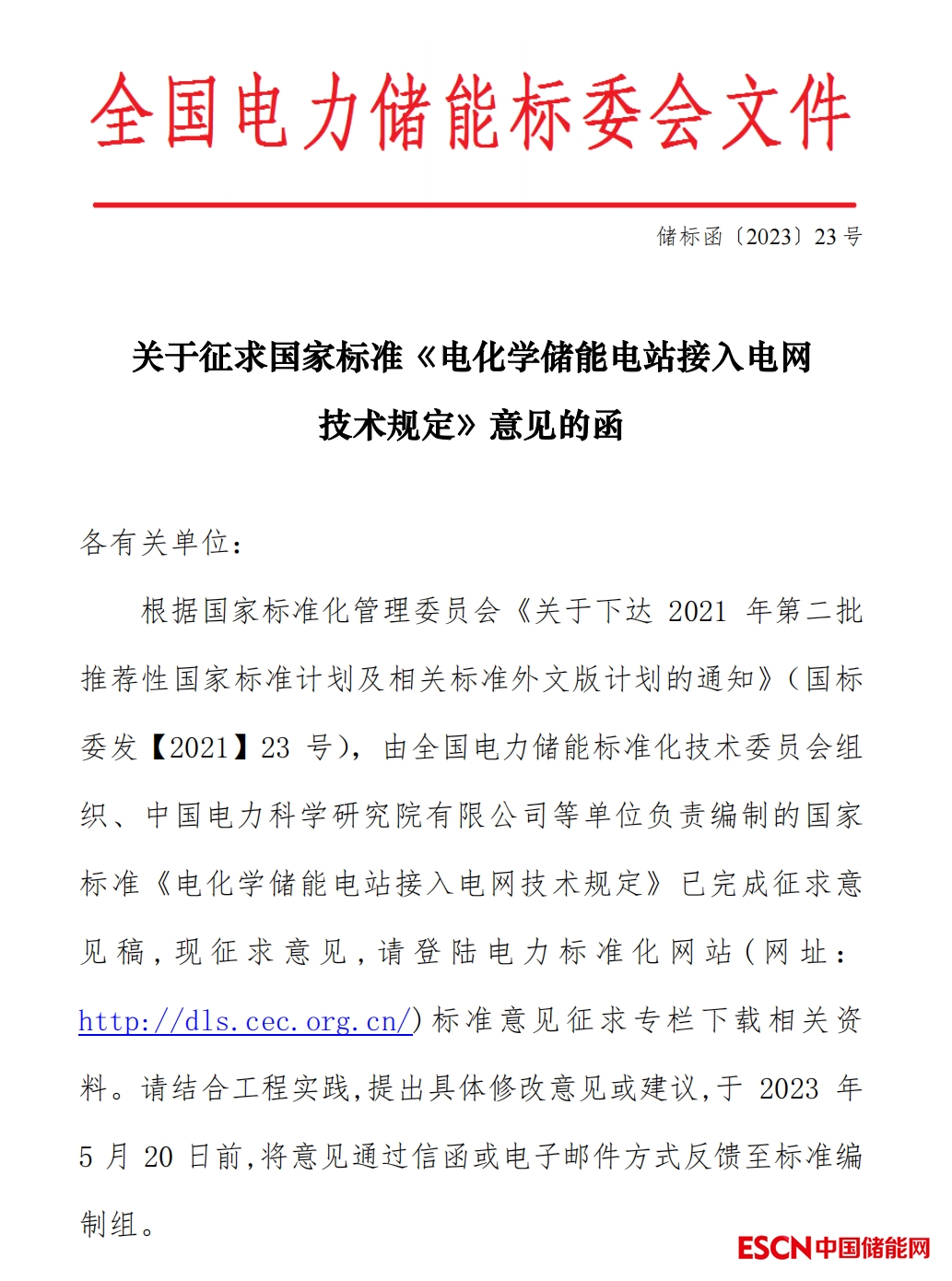 關于征求國家標準《 電化學儲能電站接入電網(wǎng)技術規(guī)定》意見的函