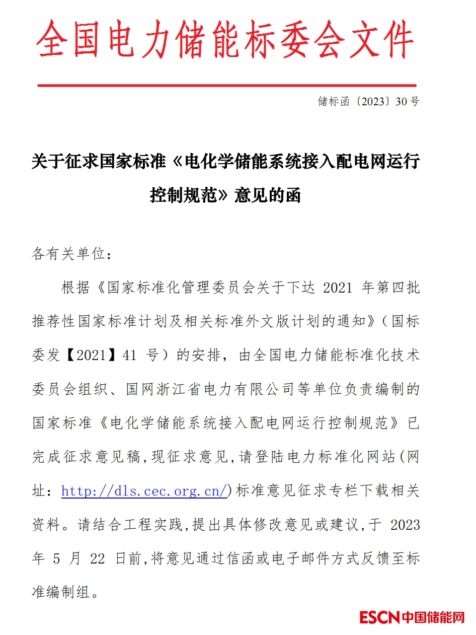 關(guān)于征求國(guó)家標(biāo)準(zhǔn)《 電化學(xué)儲(chǔ)能系統(tǒng)接入配電網(wǎng)運(yùn)行控制規(guī)范》意見的函