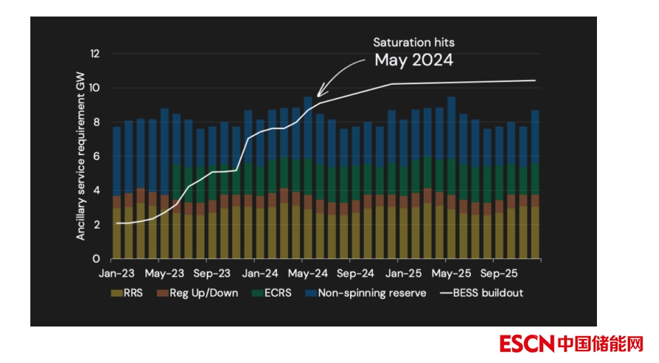 Modo Energy公司在美國儲能峰會上播放的演示幻燈片顯示了其預計德克薩斯州輔助服務市場何時飽和