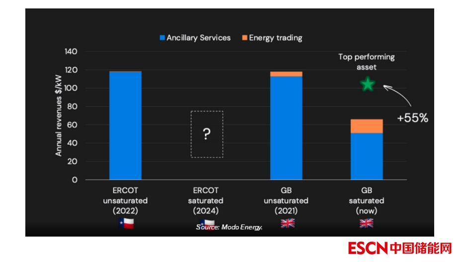 Modo Energy公司的Draper-Scrimshire將德克薩斯州電池儲能市場的發(fā)展與英國儲能市場進行了比較。并指出盡管電池儲能系統(tǒng)裝機容量不斷增長,獲得的收入與2021年相比有所下降,但表現(xiàn)最好的儲能系統(tǒng)可能會保持在原來的收入水平。