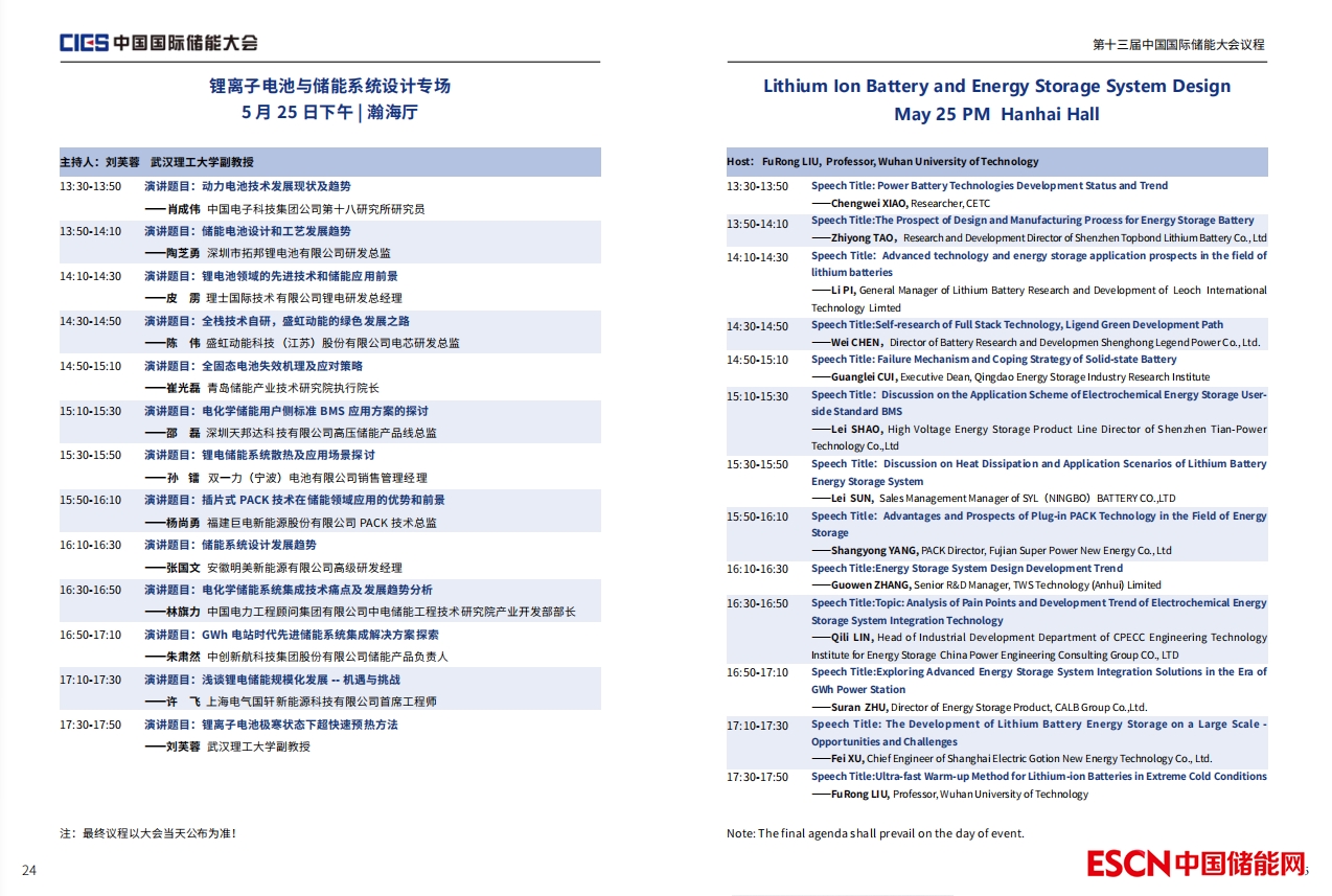 大會(huì)安排有開幕式暨院士/專家主題報(bào)告、“雙碳”目標(biāo)下儲(chǔ)能產(chǎn)業(yè)發(fā)展新路徑專場、新型電力系統(tǒng)與儲(chǔ)能系統(tǒng)整體解決方案專場、儲(chǔ)能安全與系統(tǒng)集成專場、獨(dú)立共享儲(chǔ)能電站專場、新型儲(chǔ)能系統(tǒng)集成解決方案專場、用戶側(cè)儲(chǔ)能與虛擬電廠專場、儲(chǔ)能安全與消防系統(tǒng)專場、長時(shí)儲(chǔ)能技術(shù)及應(yīng)用專場、儲(chǔ)能檢測、認(rèn)證與標(biāo)準(zhǔn)專場、鋰離子電池與儲(chǔ)能系統(tǒng)設(shè)計(jì)專場、智能微電網(wǎng)及分布式能源專場、儲(chǔ)能資本市場專場(上下)、儲(chǔ)能與電力市場專場、中國西北儲(chǔ)能市場專場、溫控系統(tǒng)及電氣設(shè)備專場等17個(gè)專場論壇。