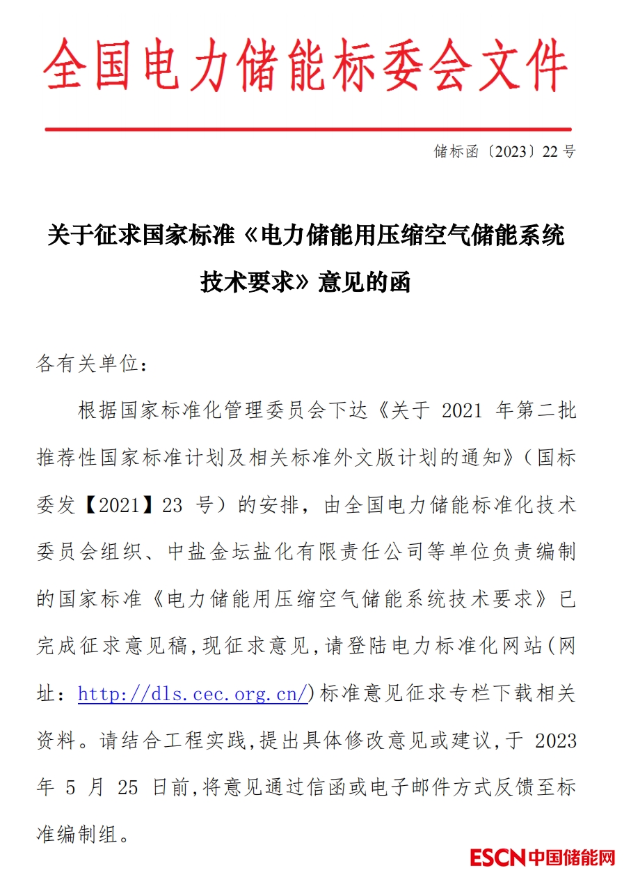 關(guān)于征求國家標(biāo)準(zhǔn)《電力儲(chǔ)能用壓縮空氣儲(chǔ)能系統(tǒng)技術(shù)要求》意見的函