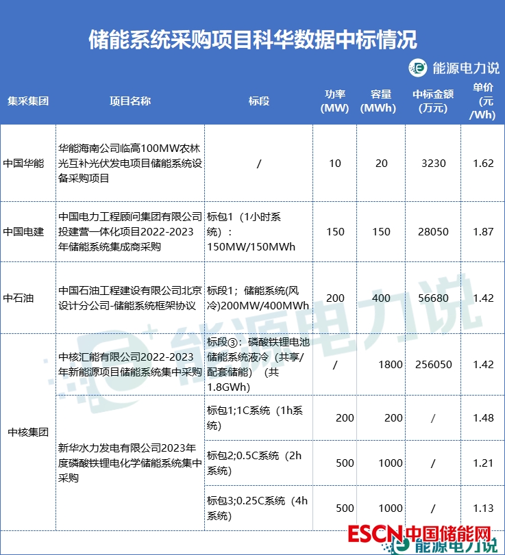 科華數(shù)據(jù)中標(biāo)了電建、華能、中石油、中核等集團的儲能系統(tǒng)采購項目,中標(biāo)單價在1.13-1.87元/Wh之間。