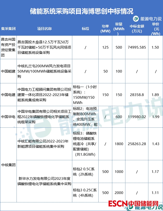 海博思創(chuàng)中標(biāo)了昌吉州國有資產(chǎn)投資經(jīng)營集團、電建、能建、華電、中核集團的儲能系統(tǒng)采購項目,中標(biāo)單價在1.11-1.89元/Wh之間。