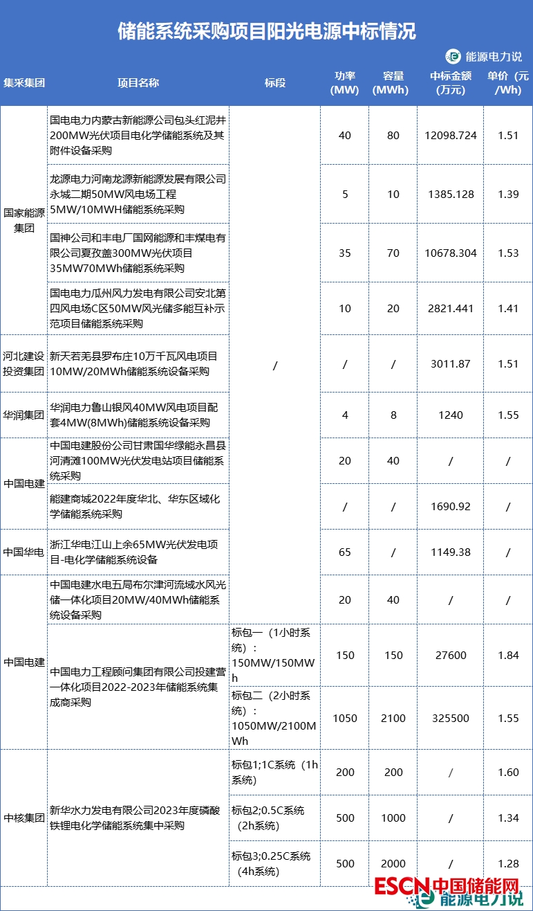 在統(tǒng)計的117個項目中,陽光電源中標(biāo)了國家能源集團、電建、華電等多個集團采購的儲能系統(tǒng)采購項目,中標(biāo)單價在1.40-1.89元/Wh之間。其中,陽光電源成功入圍新華水電2023年磷酸鐵鋰儲能系統(tǒng)集采3個標(biāo)段。