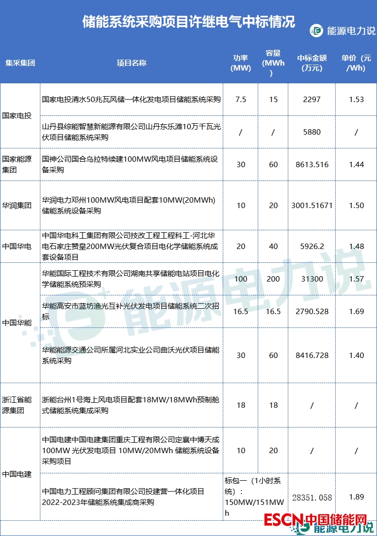 許繼電氣中標(biāo)了國家電投、國家能源集團、華潤、華能、電建等集團的11個儲能系統(tǒng)采購項目,類型涉及新能源配儲、共享儲能、儲能系統(tǒng)集采,中標(biāo)報價在1.40-1.89元/Wh。