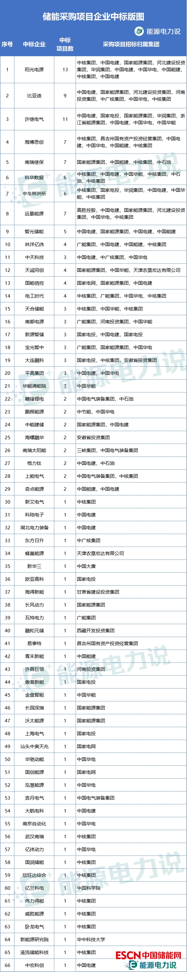在統(tǒng)計的在各大集團單位117個儲能系統(tǒng)采購項目中,共66家企業(yè)中標(biāo),包括比亞迪、海博思創(chuàng)、遠景能源、科華數(shù)據(jù)、許繼電氣、智光電氣、南瑞繼保、中車株洲所、山東電工時代、林洋億偉、中天科技、天誠同創(chuàng)和天津瑞源電氣等。