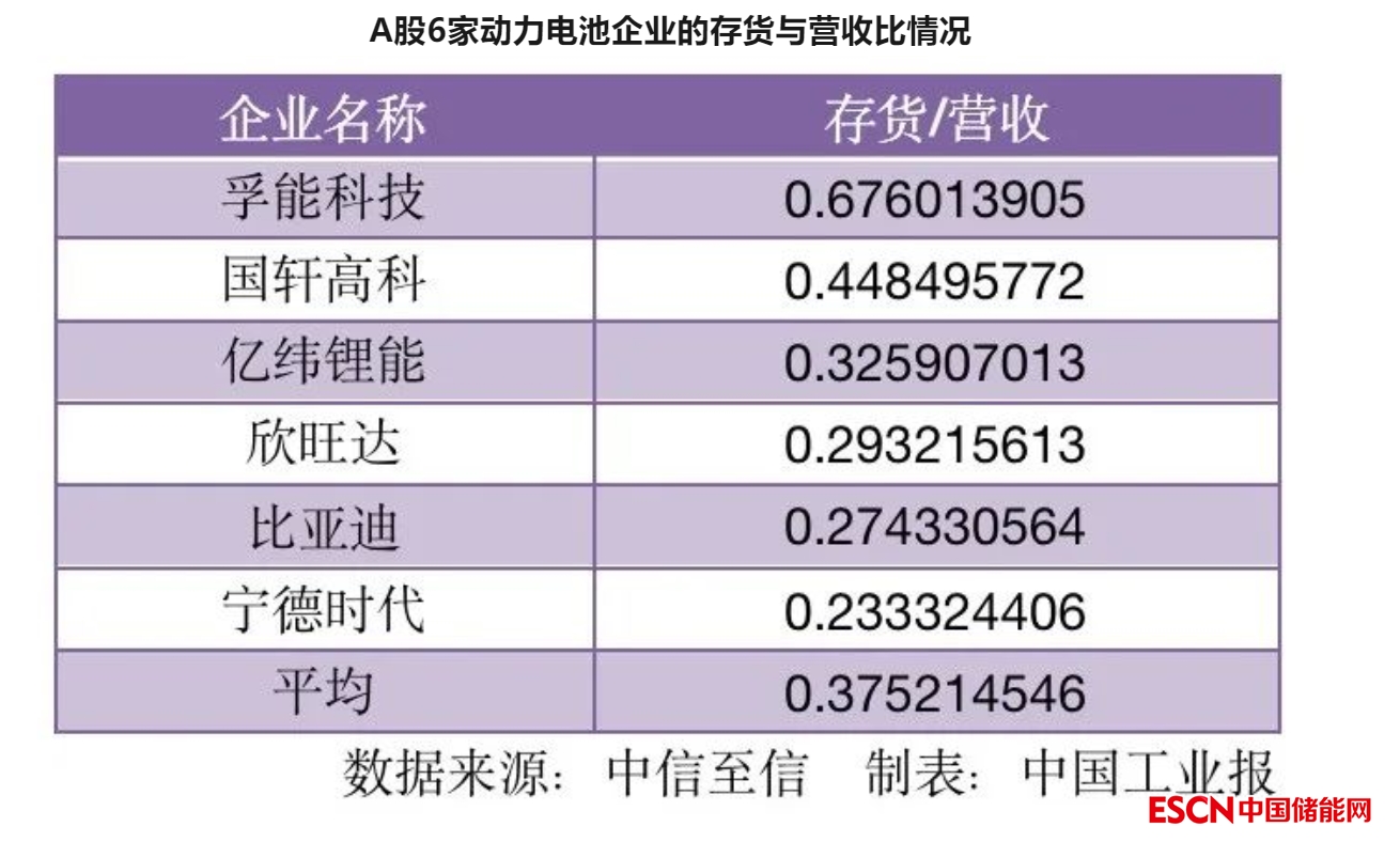 數(shù)據(jù)顯示,目前孚能科技的庫存與營(yíng)業(yè)收入的比值為67.6%,國(guó)軒高科的庫存與營(yíng)業(yè)收入的比值為44.85%,億緯鋰能的庫存與營(yíng)業(yè)收入的比值為32.59%,欣旺達(dá)的庫存與營(yíng)業(yè)收入的比值為29.32%,比亞迪的庫存與營(yíng)業(yè)收入的比值為27.43%,寧德時(shí)代的庫存與營(yíng)業(yè)收入的比值為23.33%。上述6家公司的庫存與營(yíng)業(yè)收入的比值平均為37.52%。
