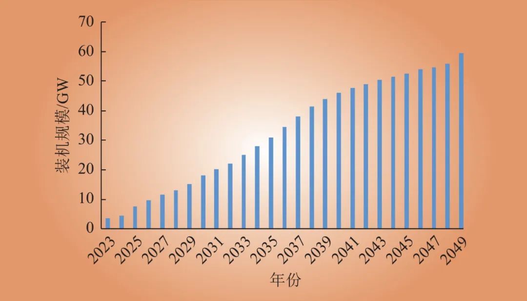 2021年12月,澳大利亞能源市場(chǎng)運(yùn)營(yíng)機(jī)構(gòu)(AEMO)發(fā)布2022年綜合能源計(jì)劃(ISP2022),計(jì)劃到2049年儲(chǔ)能規(guī)模接近60 GW,預(yù)測(cè)規(guī)模如圖3所示[24]。其中,戶用型儲(chǔ)能(含光儲(chǔ))占比70%,大型電池儲(chǔ)能占比20%,抽蓄等其他儲(chǔ)能占比10%。