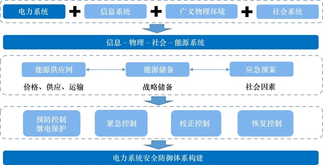 在信息物理社會(huì)系統(tǒng)框架方面,采用機(jī)理分析和沙盤推演手段,開展極端事件、綜合能源、政策機(jī)制、規(guī)劃運(yùn)行的“時(shí) ? 空 ? 物”要素分析;研究不確定性因素對(duì)能源 ? 電力可靠性及經(jīng)濟(jì)性的影響規(guī)律,構(gòu)建覆蓋電力系統(tǒng)運(yùn)行過程,具有多類目標(biāo)、多道防線能力的電力安全主動(dòng)防御體系。