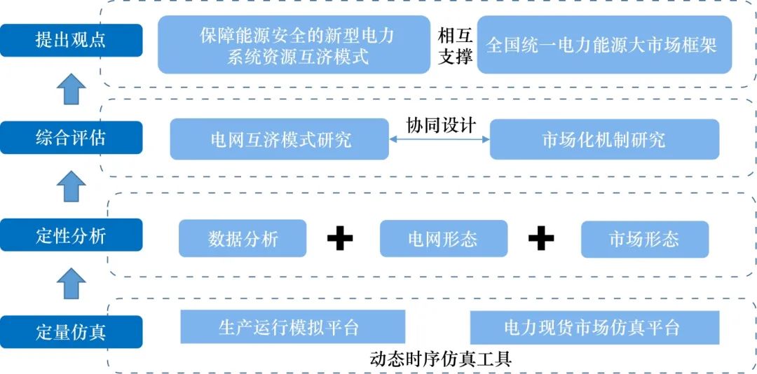 在資源配置模式方面,采取定量仿真、定性分析、綜合評(píng)估等方式,根據(jù)生產(chǎn)運(yùn)行模擬平臺(tái)、電力現(xiàn)貨市場(chǎng)仿真平臺(tái)的結(jié)果,融合電網(wǎng)形態(tài)及市場(chǎng)形態(tài)數(shù)據(jù)分析,論證形成新型能源體系下電網(wǎng)互濟(jì)模式及相應(yīng)的市場(chǎng)支撐機(jī)制,從而構(gòu)建新型電力系統(tǒng)資源互濟(jì)模式、全國統(tǒng)一電力能源大市場(chǎng)框架相互支撐的大范圍共享互濟(jì)體系。