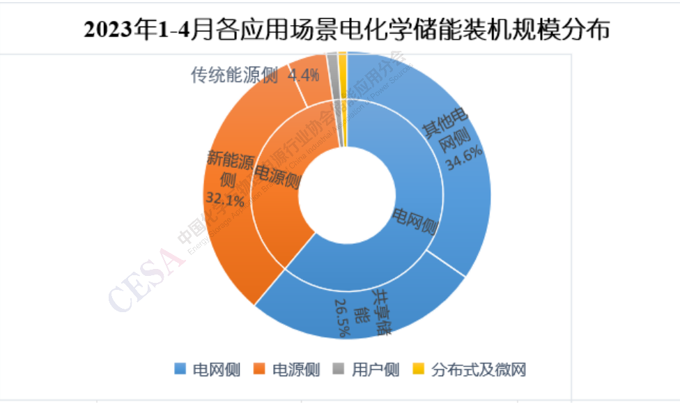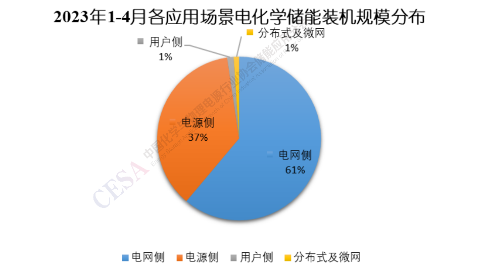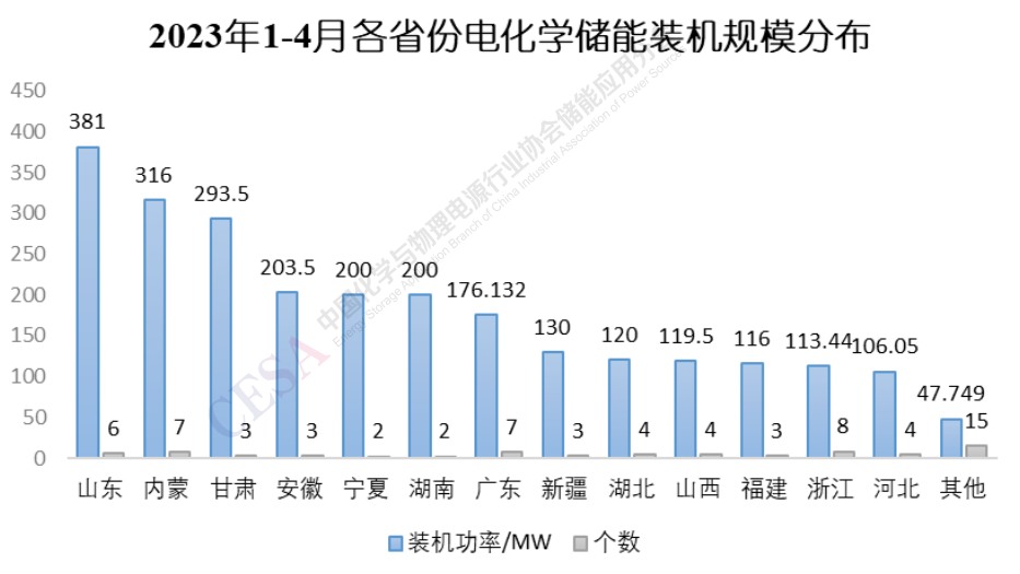 由圖5可知,2023年1-4月份共有13個(gè)省份電化學(xué)儲(chǔ)能項(xiàng)目裝機(jī)規(guī)模達(dá)到100MW,依次是山東、內(nèi)蒙古、甘肅、安徽、寧夏、湖南、廣東、新疆、湖北、山西、福建、浙江和河北。其中山東和內(nèi)蒙古裝機(jī)規(guī)模分別為381MW和316MW,從規(guī)模和數(shù)量總體上講,在各省份中遙遙領(lǐng)先,山東共有山東沂水300MW/600MWh儲(chǔ)能示范項(xiàng)目一期和萊北華電獨(dú)立儲(chǔ)能電站2個(gè)100MW級(jí)電網(wǎng)側(cè)儲(chǔ)能項(xiàng)目投運(yùn);同樣得益于兩個(gè)100MW級(jí)儲(chǔ)能項(xiàng)目的投運(yùn),甘肅電化學(xué)儲(chǔ)能裝機(jī)規(guī)模位列各省份第3位,其中由中國(guó)能建西北院設(shè)計(jì)的330千伏建航儲(chǔ)能電站一期工程最為惹眼,它是目前全國(guó)電壓等級(jí)最高的儲(chǔ)能電站,其作為甘肅省“十四五”第一批新能源項(xiàng)目的代表之一,為甘肅新型儲(chǔ)能項(xiàng)目的發(fā)展樹立了榜樣;安徽、寧夏、湖南三個(gè)省份,自去年開始大力發(fā)展大型電網(wǎng)側(cè)共享儲(chǔ)能和獨(dú)立儲(chǔ)能項(xiàng)目,1-4月,也各有兩個(gè)100MW級(jí)電化學(xué)儲(chǔ)能項(xiàng)目投運(yùn),裝機(jī)規(guī)模躋身前列,廣東和浙江兩省電化學(xué)儲(chǔ)能項(xiàng)目投運(yùn)個(gè)數(shù)頗多,但總裝機(jī)規(guī)模相對(duì)較小,這主要是其用戶側(cè)儲(chǔ)能占比較大的應(yīng)用場(chǎng)景構(gòu)成導(dǎo)致的。