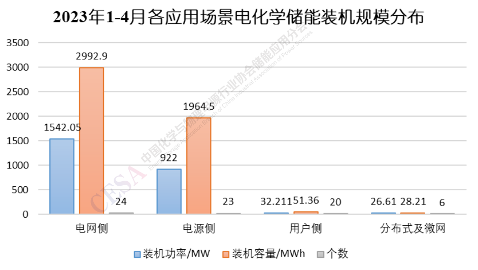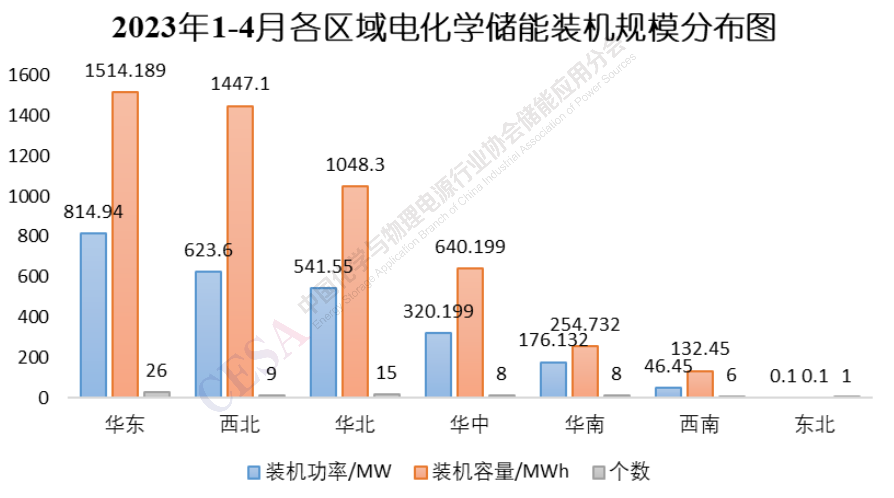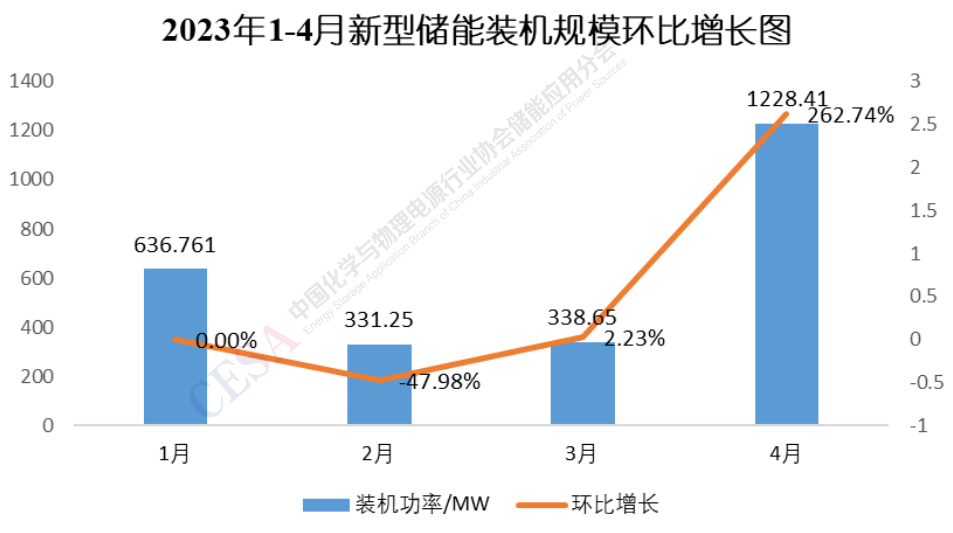 由圖1可見,2023年1-4月新型儲(chǔ)能裝機(jī)功率從數(shù)量和體量上較前兩年都有較大增長(zhǎng),裝機(jī)功率較去年同期(374.4MW)同比增長(zhǎng)577.1%,總規(guī)模達(dá)到2535.07MW。