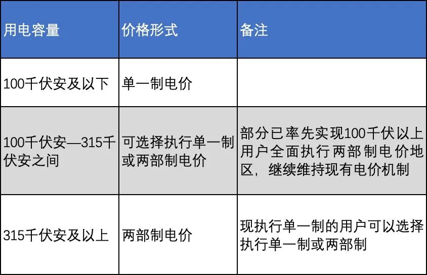 在價格形式上,現(xiàn)行普遍做法是一般工商業(yè)及其他用戶執(zhí)行單一制電價,大工業(yè)用戶實行兩部制電價。第三監(jiān)管周期不再區(qū)分用戶類別后,原則上按用電容量不同確定執(zhí)行單一制電價或兩部制電價,在繼續(xù)逐步擴(kuò)大兩部制電價執(zhí)行范圍的同時,考慮電價政策平穩(wěn)實施,規(guī)定對100千伏安以上現(xiàn)行執(zhí)行單一制電價的用戶,由用戶選擇執(zhí)行單一制或兩部制電價。