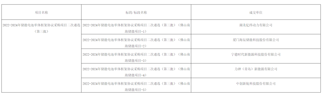 中國儲能網(wǎng)訊:5月15日南方電網(wǎng)供應鏈公司公布了2022-2024年儲能電池單體框架協(xié)議采購項目二次遴選(第三批)成交公告。