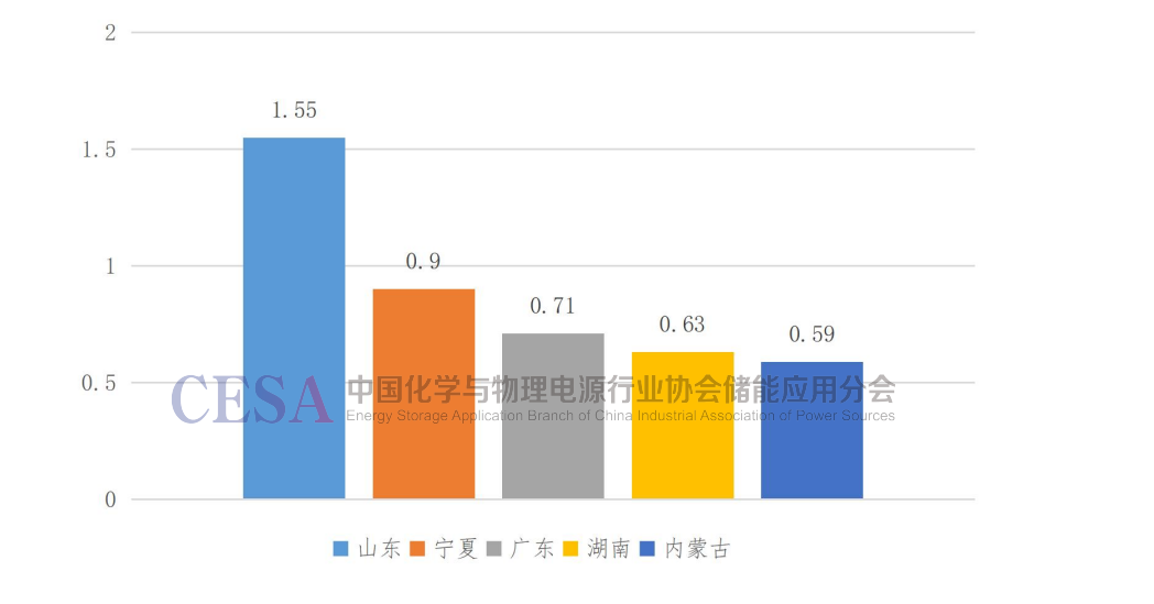 8.2022年底山東、寧夏、廣東、湖南和內(nèi)蒙古累計(jì)新型儲(chǔ)能裝機(jī)規(guī)模排名前5