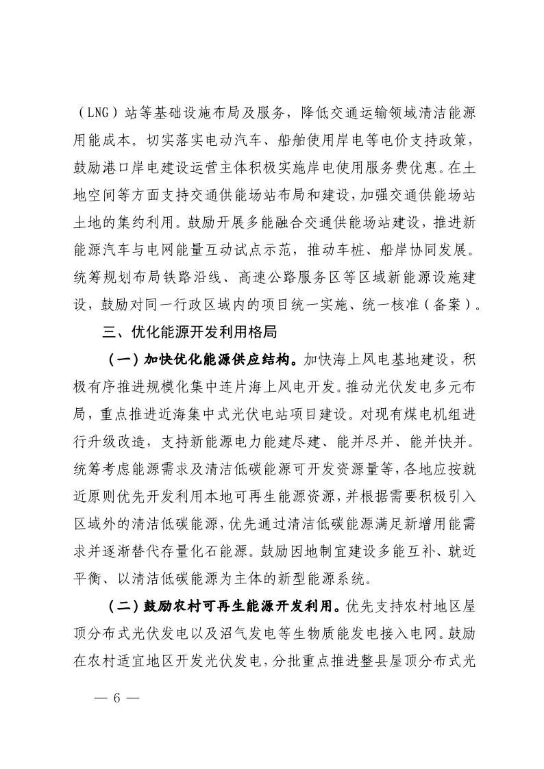 文件指出,加快優(yōu)化能源供應(yīng)結(jié)構(gòu)。加快海上風(fēng)電基地建設(shè),積極有序推進(jìn)規(guī)?;羞B片海上風(fēng)電開(kāi)發(fā)。推動(dòng)光伏發(fā)電多元布局,重點(diǎn)推進(jìn)近海集中式光伏電站項(xiàng)目建設(shè)。對(duì)現(xiàn)有煤電機(jī)組進(jìn)行升級(jí)改造,支持新能源電力能建盡建、能并盡并、能并快并統(tǒng)籌考慮能源需求及清潔低碳能源可開(kāi)發(fā)資源量等,各地應(yīng)按就近原則優(yōu)先開(kāi)發(fā)利用本地可再生能源資源,并根據(jù)需要積極引入?yún)^(qū)域外的清潔低碳能源,優(yōu)先通過(guò)清潔低碳能源滿足新增用能需求并逐漸替代存量化石能源。鼓勵(lì)因地制宜建設(shè)多能互補(bǔ)、就近平衡、以清潔低碳能源為主體的新型能源系統(tǒng)。