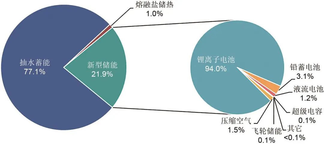 根據(jù)中國(guó)能源研究會(huì)儲(chǔ)能專(zhuān)委會(huì)/中關(guān)村儲(chǔ)能產(chǎn)業(yè)技術(shù)聯(lián)盟全球儲(chǔ)能數(shù)據(jù)庫(kù)的不完全統(tǒng)計(jì),截至到2022年底,中國(guó)已投運(yùn)的儲(chǔ)能項(xiàng)目累計(jì)裝機(jī)容量(包括物理儲(chǔ)能、化學(xué)儲(chǔ)能以及熔融鹽儲(chǔ)熱)達(dá)到59.8 GW,同比增長(zhǎng)38%;其中抽水蓄能為46.7 GW,同比增長(zhǎng)24.2%,新型儲(chǔ)能(除抽水蓄能外的電力儲(chǔ)能技術(shù))為13.1 GW,同比增長(zhǎng)128.2%,如圖8所示。2022年,我國(guó)儲(chǔ)能裝機(jī)繼續(xù)保持高速增長(zhǎng),新增投運(yùn)儲(chǔ)能裝機(jī)容量16.5 GW,居世界第一位;新增儲(chǔ)能裝機(jī)量同比增長(zhǎng)114%,包括抽水蓄能9.1 GW,新型儲(chǔ)能7.4 GW;新型儲(chǔ)能新增裝機(jī)規(guī)模首次突破7.0 GW,同比增長(zhǎng)200%。從圖8可見(jiàn),雖然抽水蓄能新增裝機(jī)規(guī)模加大,但由于新型儲(chǔ)能裝機(jī)增長(zhǎng)幅度更大,我國(guó)抽水蓄能裝機(jī)比例在2022年首次低于80%;在新型儲(chǔ)能技術(shù)中,鋰離子電池裝機(jī)為94.0%,占據(jù)主導(dǎo)地位;壓縮空氣儲(chǔ)能、液流電池、鉛蓄電池和儲(chǔ)熱儲(chǔ)冷技術(shù)裝機(jī)也超過(guò)1%,也占據(jù)一定的市場(chǎng)份額。