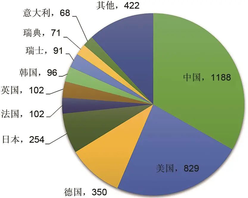 圖3給出了依據(jù)“Web of Science”核心數(shù)據(jù)庫(kù),以“Energy Storage”為主題詞統(tǒng)計(jì)2010—2022年世界主要國(guó)家關(guān)于儲(chǔ)能技術(shù)發(fā)表的SCI論文數(shù),其中中國(guó)、美國(guó)、印度、韓國(guó)、德國(guó)、英國(guó)、澳大利亞、日本、法國(guó)、意大利、伊朗、沙特位列前12位。需要說(shuō)明的是,圖3中的2010—2021年發(fā)表SCI論文的數(shù)據(jù)和文獻(xiàn)[6]中的數(shù)據(jù)稍有不同,主要是由于“Web of Science”數(shù)據(jù)庫(kù)本身更新的原因,但總體趨勢(shì)與文獻(xiàn)[6]是一致的。相較于2021年,中國(guó)、印度和沙特2022年度發(fā)表SCI論文數(shù)有明顯增加,而美國(guó)在2022年度發(fā)表SCI論文數(shù)2928篇,相較于2021年的3339篇有所減少,其他國(guó)家在2022年度發(fā)表SCI論文數(shù)相較于2021年變化不大。