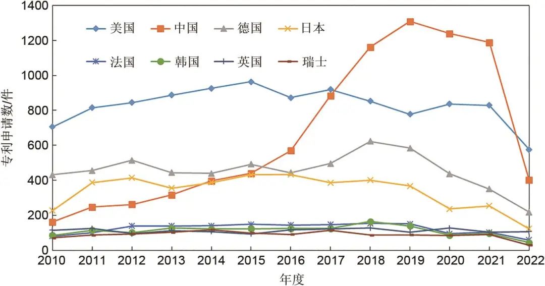 圖6給出了依據(jù)全球?qū)@麛?shù)據(jù)庫(kù)incoPat,以“Energy Storage”為主題詞在世界知識(shí)產(chǎn)權(quán)數(shù)據(jù)庫(kù)(WIPO)中統(tǒng)計(jì)的,2010—2022年世界主要國(guó)家關(guān)于儲(chǔ)能技術(shù)申請(qǐng)的國(guó)際發(fā)明專(zhuān)利數(shù)。需要說(shuō)明的是,2022年各國(guó)儲(chǔ)能技術(shù)發(fā)明專(zhuān)利申請(qǐng)數(shù)明顯偏低,這是由于數(shù)據(jù)庫(kù)統(tǒng)計(jì)滯后的原因,因此圖中2010—2021年的數(shù)據(jù)更具參考價(jià)值。圖中可見(jiàn),美國(guó)、中國(guó)、德國(guó)、日本、法國(guó)、韓國(guó)、英國(guó)、瑞士位列2010—2022年累計(jì)發(fā)明專(zhuān)利申請(qǐng)數(shù)前8名。從總體趨勢(shì)上看,除中國(guó)外,其他7個(gè)國(guó)家的儲(chǔ)能?chē)?guó)際發(fā)明專(zhuān)利申請(qǐng)數(shù)均基本穩(wěn)定,而中國(guó)儲(chǔ)能?chē)?guó)際發(fā)明專(zhuān)利申請(qǐng)數(shù)呈現(xiàn)持續(xù)增長(zhǎng)趨勢(shì),從2010年的全球第4位,提升到2018年的第一位,并且在此后一直保持居于世界第一位。盡管從2010—2022年WIPO國(guó)際發(fā)明專(zhuān)利累計(jì)總申請(qǐng)數(shù)中國(guó)仍少于美國(guó),但自2018年中國(guó)超越美國(guó)后,中國(guó)儲(chǔ)能?chē)?guó)際發(fā)明專(zhuān)利申請(qǐng)數(shù)均高于美國(guó)(不考慮2022年滯后數(shù)據(jù))。