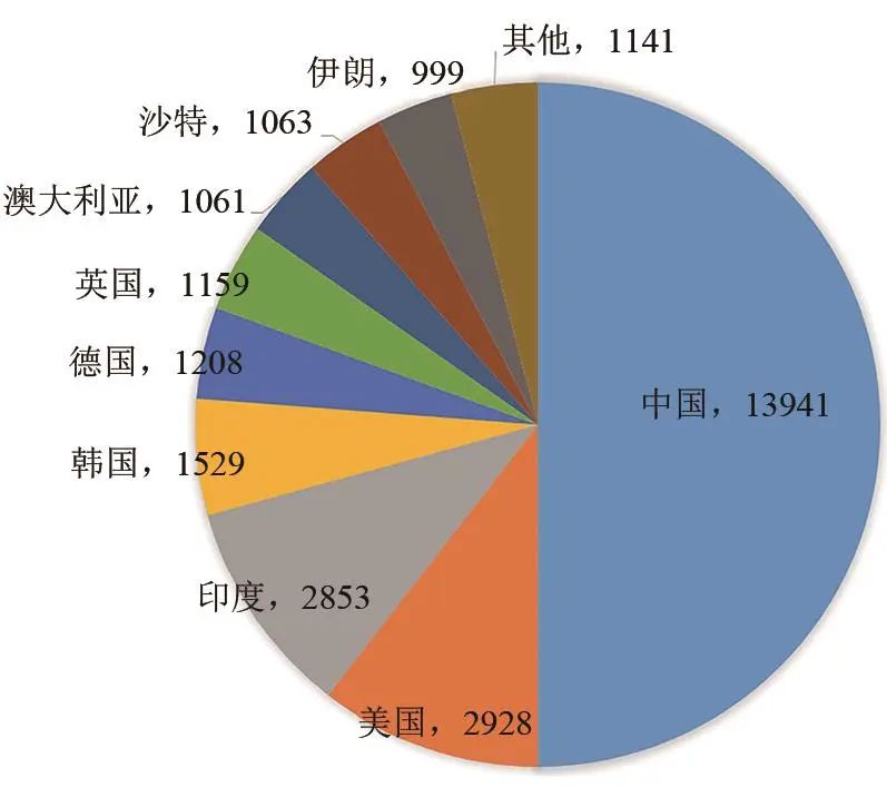 圖2給出了依據(jù)“Web of Science”核心數(shù)據(jù)庫(kù),以“Energy Storage”為主題詞統(tǒng)計(jì)的2022年度世界主要國(guó)家關(guān)于儲(chǔ)能技術(shù)發(fā)表的SCI論文數(shù)。從圖中可以看出,2022年,全世界共發(fā)表儲(chǔ)能技術(shù)相關(guān)SCI論文27884篇,較2021年有小幅增加。其中,中國(guó)、美國(guó)、印度、韓國(guó)、德國(guó)、英國(guó)、澳大利亞、沙特8個(gè)國(guó)家發(fā)表SCI論文數(shù)超過(guò)1000篇,伊朗發(fā)表999篇,也接近1000篇。與2021年相比,發(fā)表SCI論文數(shù)超過(guò)1000篇的國(guó)家增加1名,即沙特。2022年度,中國(guó)機(jī)構(gòu)和學(xué)者發(fā)表了13941篇SCI論文,繼續(xù)位居世界第一,在全世界儲(chǔ)能領(lǐng)域發(fā)表SCI論文數(shù)占比達(dá)到50.0%,比2021年有所增加。中國(guó)保持了全球儲(chǔ)能技術(shù)基礎(chǔ)研究最活躍國(guó)家的地位,且領(lǐng)先程度在進(jìn)一步擴(kuò)大。從分項(xiàng)技術(shù)看,圖1中所列出的所有單項(xiàng)技術(shù),包括抽水蓄能、壓縮空氣、儲(chǔ)熱、飛輪、鋰離子電池、超級(jí)電容、鈉離子電池、鉛電池、液態(tài)金屬、液流電池,中國(guó)機(jī)構(gòu)和學(xué)者2022年發(fā)表的SCI論文數(shù)均位于世界第一。