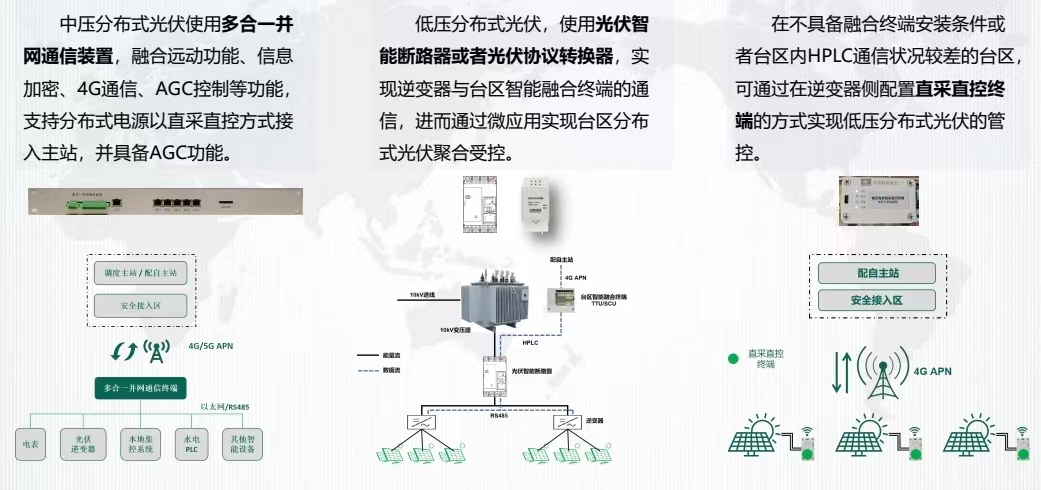 通過交易系統(tǒng)解決綠電需求,在調(diào)控聚合方面,除了管控系統(tǒng)我們也研發(fā)應(yīng)用了性價比高的各監(jiān)測控制點的終端裝置,在在10KV并網(wǎng)點和低壓區(qū)域分布式光伏聚合并網(wǎng)點加裝多合一并網(wǎng)終端,能夠正確接收并自動執(zhí)行調(diào)度、配自主站下發(fā)的指令,對逆變器、PLC、本地集控系統(tǒng)等進行調(diào)節(jié),從而實現(xiàn)AGC子站功能。