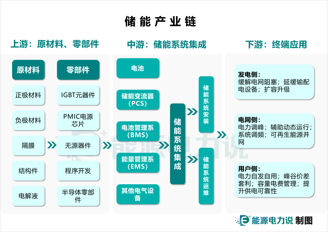 中國儲能網(wǎng)訊:從電化學(xué)儲能系統(tǒng)產(chǎn)業(yè)鏈來看,上游是電池原材料、電子元器件供應(yīng)商等;中游是儲能系統(tǒng)集成;下游應(yīng)用端則是風(fēng)光電站、電網(wǎng)系統(tǒng)、戶用/工商業(yè)、通信運(yùn)營商、數(shù)據(jù)中心等終端用戶。一個(gè)典型的電化學(xué)儲能系統(tǒng)主要由電池、儲能變流器(PCS)、電池管理系統(tǒng)(BMS)、能量管理系統(tǒng)(EMS)四個(gè)核心部分構(gòu)成。