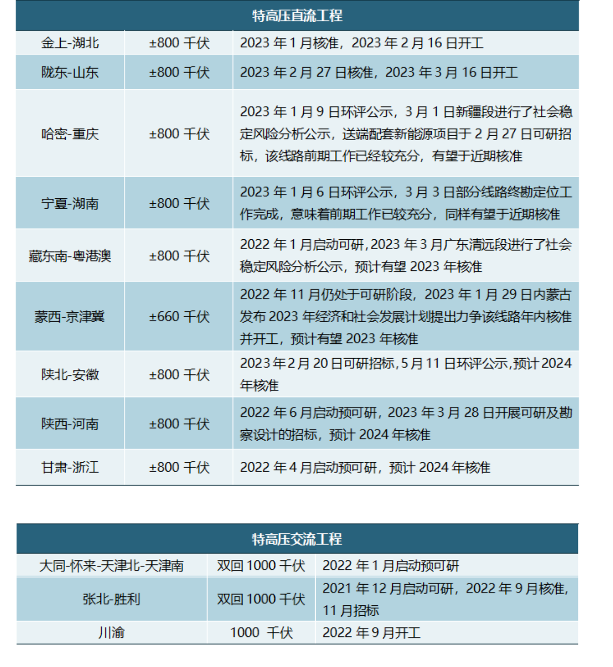進(jìn)入2023年,以沙漠、戈壁、荒漠地區(qū)為重點(diǎn)的大型風(fēng)光基地建設(shè)正在提速。隨著大型風(fēng)光基地建設(shè)提速,新能源并網(wǎng)消納以及跨區(qū)域電力輸送問題亟待進(jìn)一步解決,特高壓有望迎來投資建設(shè)高峰。