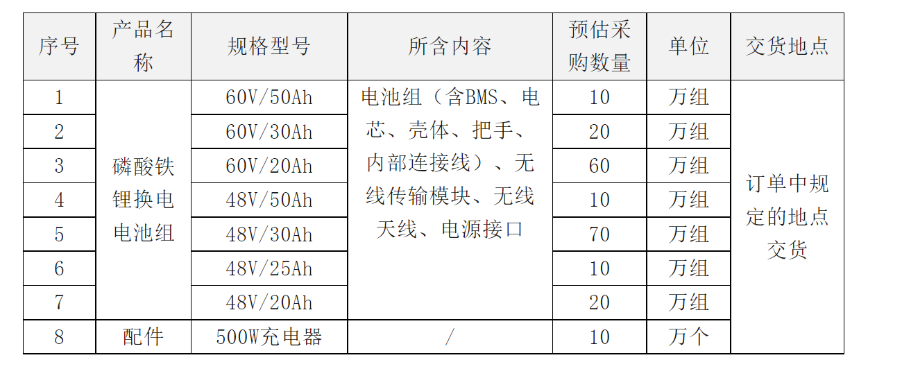 據(jù)此前招標公告,本次集中招標共2.94GWh磷酸鐵鋰換電電池組,500W充電器10萬個。本項目電池組不含稅報價單價不得高于1.283元/Wh。