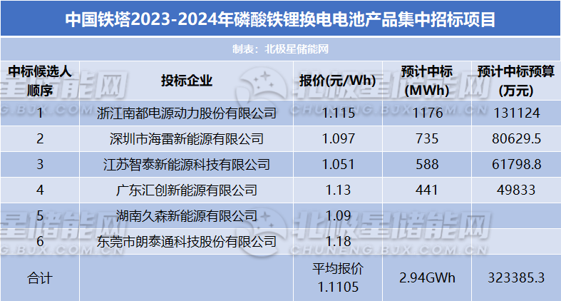 本次評選結果,6家企業(yè)報價單價平均為1.1105元/Wh,前四名中標候選人預計將獲得中標,預計總中標預算323,385.3萬元。