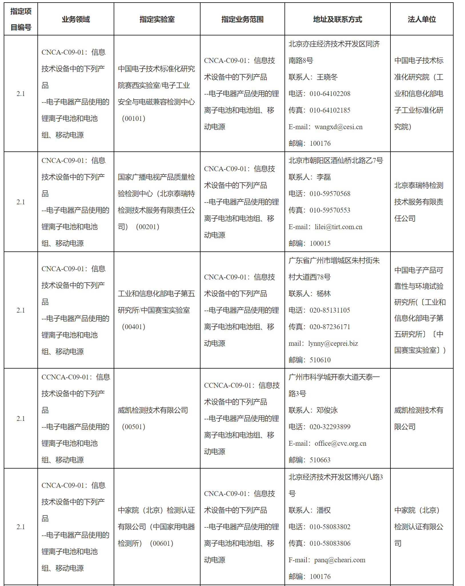 根據(jù)《認(rèn)證認(rèn)可條例》、《強(qiáng)制性產(chǎn)品認(rèn)證機(jī)構(gòu)和實(shí)驗(yàn)室管理辦法》和《認(rèn)監(jiān)委關(guān)于開(kāi)展鋰離子電池等產(chǎn)品強(qiáng)制性產(chǎn)品認(rèn)證實(shí)施機(jī)構(gòu)指定工作的公告》(2023年第5號(hào)),現(xiàn)對(duì)電子電器產(chǎn)品使用的鋰離子電池和電池組、移動(dòng)電源強(qiáng)制性產(chǎn)品認(rèn)證實(shí)驗(yàn)室指定決定予以公告。
