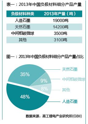 高工鋰電產(chǎn)業(yè)研究所( G B I I ) 統(tǒng)計(jì),2 0 1 3年中國負(fù)極材料出貨量達(dá)3 9 8 0 0噸,同比增長40.7%。目前負(fù)極材料仍以石墨為主,2013年國內(nèi)石墨類負(fù)極材料占總產(chǎn)量的8 3 . 4 1 % 。石墨負(fù)極材料分為人造石墨和天然石墨, 其中人造石墨2013年出貨19000噸, 天然石墨出貨1 4 2 0 0噸(表一、圖一)。