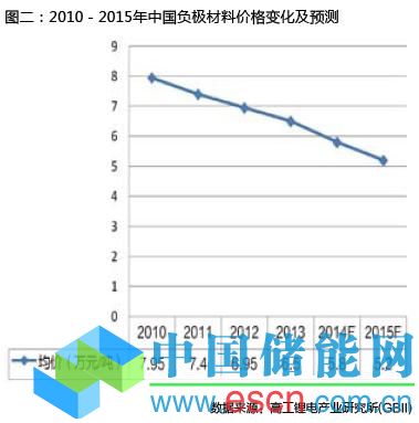 石墨類負(fù)極材料的價(jià)格近幾年呈現(xiàn)持續(xù)下降的趨勢,而且預(yù)計(jì)未來幾年這一趨勢仍將維持。預(yù)計(jì)未來3年負(fù)極材料均價(jià)會維持5%-10%的年均跌幅(圖二)。價(jià)格逐年下降,負(fù)極材料的毛利率隨之下滑,2013年國內(nèi)負(fù)極材料的毛利率在15-20%之間。